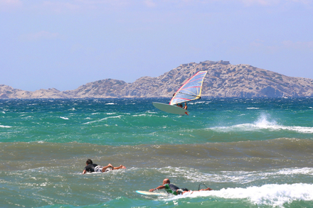 À l’est de la rade sud, la Pointe Rouge est sans conteste le spot emblématique de Marseille. Exposée aux vents d’est et de sud-est, la plage se met à fonctionner dès qu’un coup de mer sérieux traverse le bassin méditerranéen. Les vagues y sont généralement courtes, rapides, parfois creuses lorsque le vent est bien orienté. Le plan d’eau peut devenir agité, avec du clapot, mais les lignes restent exploitables. Les sessions d’hiver offrent souvent les meilleures conditions, lorsque les dépressions creusent la mer et que la fréquentation reste raisonnable. Surfer face aux collines marseillaises, avec la silhouette de la ville en arrière-plan, donne à chaque session une atmosphère singulière, presque urbaine.