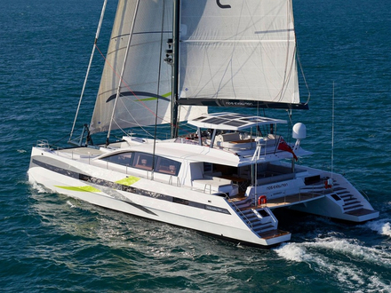 La cabine armateur occupe toute la largeur du bateau, avec un coin salon, sa vue panoramique, son accès privé au pont avant, et son incroyable luminosité. La coque bâbord accueille la salle de bains de la cabine armateur, une cabine enfants avec trois lits ainsi qu'une cabine invités à l'arrière. La coque tribord offre également une cabine invités à l'arrière. La partie avant est dédiée à l'équipage avec la cabine du capitaine, une cabine double, une vaste cuisine avec son crew mess.
