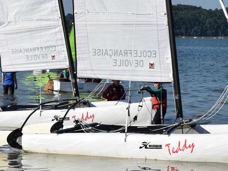 Pour le responsable de la base qui connaît parfaitement ce sujet et le comportement des enfants, le premier point est qu’ils doivent savoir nager et être en bonne condition physique (certificat médical exigé). A partir de là, les enfants, dès l’âge de 7 ans, peuvent pratiquer l’Optimist. Ce bateau, bien connu, leur permet de découvrir la voile et de la pratiquer en étant seul à bord. Le gros intérêt est qu’ils prennent conscience qu’ils ont la responsabilité d’un bateau. C’est un point important pour les enfants timides et réservés mais également pour les intrépides qui comprennent vite qu’il y des règles à respecter. Ce bateau est bien adapté pour l’initiation jusqu’à 10 ans. Au-delà (de 10 à 14 ans), il est réservé à ceux qui souhaitent faire de la compétition. A partir de 10 ans deux possibilités : la planche à voile si l’enfant a une corpulence qui le permet et, là, le moniteur est capable d’en juger ou alors le catamaran. Ce dernier se pratique à deux équipiers et ce sont, bien souvent, des anciens pratiquants de l’Optimist. Reste la planche à voile, beaucoup y viennent après un stage de catamaran ou commencent directement par elle ou font un stage de paddle, un sport qui permet de bien maîtriser l’équilibre. En pratique, pour le responsable de la base, l’Optimist est une bonne école pour les jeunes (7 à 10 ans), le catamaran ou la planche au-delà. Faire du catamaran semble facile au début mais cela devient sportif lorsque l’on veut aller plus loin. Quant à la planche à voile, les débuts sont plus difficiles que sur un catamaran, mais on est plus vite autonome.