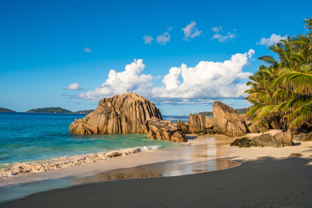 Sans doute l’une des plages les plus emblématiques au monde, Anse Source d’Argent combine sable rosé, blocs granitiques sculptés comme des œuvres d’art et un lagon d’un calme irréel. À marée basse, l’eau se retire délicatement, révélant des cuvettes naturelles idéales pour la baignade. Les palmiers forment un rideau d’ombre qui accompagne toute la plage, tandis que le récif protège l’endroit des courants. L’accès se fait à vélo, ce qui renforce l’impression d’arriver dans un décor intact. Les photographes viennent tôt pour saisir les premières lueurs qui glissent sur les rochers, et les snorkeleurs profitent d’un jardin de corail peu profond où évoluent poissons-papillons, demoiselles et tortues juvéniles. Une plage qui combine beauté brute, nature préservée et atmosphère intemporelle.