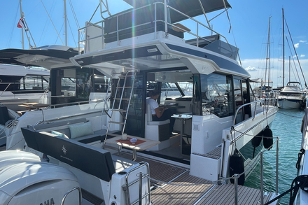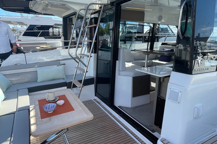 La version Coupé, plus basse, séduira quant à elle les navigateurs qui évoluent dans des régions aux ponts fréquents ou aux climats moins cléments. Son design épuré affirme un style affirmé, tout en conservant l’essence de la gamme. Le carré arrière adopte une nouvelle configuration en U, plus enveloppante, propice aux moments de détente en petit comité. Deux panneaux de toit ouvrants laissent entrer la lumière naturelle et l’air marin, tandis que les rangements intégrés pour paddleboards témoignent d’un sens pratique constant, parfaitement intégré à la ligne du bateau.