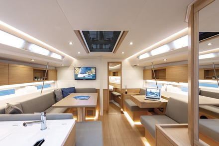 Deux versions sont proposées : deux ou trois cabines, avec deux salles d’eau dans les deux cas. Le salon s’articule autour d’un grand canapé trois places, dont la place centrale peut se transformer en table à cartes. La cuisine en L est équipée d’un réfrigérateur spacieux, d’un second en option, et de nombreux rangements qui facilitent la vie en mer.