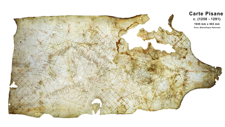 Au XIIIe siècle, de nouveaux outils apparaissent : les portulans. Ces cartes nautiques, conçues pour les marins, représentent la Méditerranée avec une exactitude étonnante, bien supérieure aux cartes terrestres contemporaines. La Carta Pisana, datée de la fin du XIIIe siècle, montre déjà un littoral précis, quadrillé de lignes de vents et de directions. Elle marque le début d’une cartographie scientifique, fondée sur l’expérience directe des navigateurs.