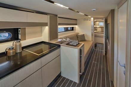 Sous le pont, l’Itama 54 allie clarté, espace et sophistication. Les vitrages latéraux pleine longueur diffusent la lumière naturelle jusque dans la dînette, où bois clair, cuir et tissus s’accordent pour créer une ambiance accueillante. Deux cabines et deux salles d’eau composent la partie nuit : une suite propriétaire à l’avant avec rangements généreux et salle de bain privative, et une cabine invités modulable en lits jumeaux ou double. La cuisine, parfaitement équipée, s’intègre dans un décor à la fois discret et élégant, pour des croisières longues sans renoncer au confort.