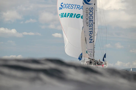 Chacun sur un bord de l’entonnoir qui conduit à Fort de France, les deux leaders glissent vers les Antilles, se tenant fermement à sa stratégie. Sur la cartographie, le spectacle est passionnant et étrange à la fois : Seafrigo-Sogestran gagne chaque jour une à deux places sans doubler ses concurrents ! Le 13 novembre dans l’après-midi, les Normands ont pris la tête de la course. Mais leur razzia prend fin et le statu quo débute. La météo de la fin de course promet un alizé très capricieux et SNSM Faites un don ! descend sur les Antilles avec un meilleur angle. Au passage de l’ilet Cabrit au Sud de la Martinique, l’écart n’est plus que de 4,5 milles entre les bateaux qui déboulent à plus de 12 noeuds. L’enroulé des Normands est parfait quand SNSM Faites un don ! qui rase la plage prend un casier dans sa quille...