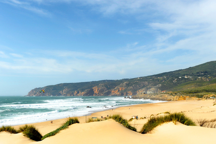 Malgré sa réputation internationale, Guincho a conservé son caractère brut. Pas d’urbanisation lourde, pas de front de mer envahissant : seulement une longue bande de sable bordée de dunes mobiles, protégées par le parc naturel. Les chemins de bois, les collines couvertes de végétation rase et la présence constante du vent rappellent que la nature reste ici maîtresse des lieux.