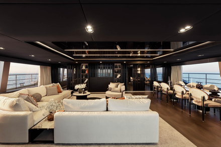 Le salon principal a été conçu pour encourager la convivialité. Une grande table fixe pour 10 personnes structure l’espace repas, tandis qu’un canapé en L, une table basse et un fauteuil confortable créent un coin lounge chaleureux. Un téléviseur escamotable intégré à une cloison de rangement centrale souligne l’approche minimaliste : lorsque l’écran est dissimulé, les lignes restent épurées et l’œil se concentre sur les panoramas marins. L’ensemble a été pensé pour permettre aux invités de partager un repas, discuter ou simplement profiter de la vue sans obstacle sur la mer.