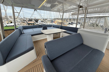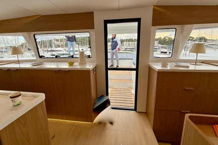 Dès la montée à bord, l’impression d’espace domine. La grande porte arrière basculante, signature de la marque, relie totalement le cockpit et le carré, donnant à l’ensemble un aspect d’openspace rare à cette taille. Carré fermé, on obtient une pièce intérieure complète, confortable, protégée et climatisée. Carré ouvert, on bascule sur un grand salon extérieur, totalement plat, très agréable au mouillage comme en navigation. La circulation est fluide, sans marches ni ruptures, et l’ergonomie générale profite d’une vraie maturité. La porte avant, autre élément emblématique de Bali, renforce encore cette fluidité. Elle facilite l’accès au pont avant, mais surtout, elle apporte une ventilation transversale exceptionnelle quand on combine les ouvertures avant et arrière. Un point de confort qui plaît autant aux familles qu’aux flottes charter.