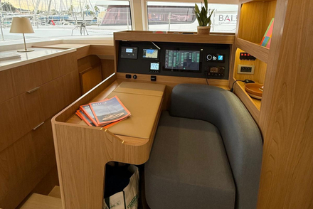 La cuisine centrale est l’un des atouts majeurs du bateau. Placée exactement au milieu du plan de pont, elle offre une visibilité avant/arrière très agréable. L’équipement est complet, digne d’une villa : large plan de travail, espaces de rangement généreux, froid important et cuisson moderne (gaz ou induction selon les options choisies). Les fenêtres ouvrantes vers le cockpit, combinées à la grande cloison arrière, créent un immense espace carré-cuisine-cockpit. Une fois la porte avant ouverte, la ventilation naturelle est remarquable, ce qui rend ce catamaran particulièrement agréable à vivre au mouillage.
