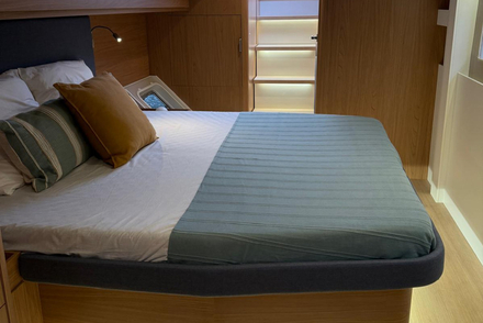 À l’intérieur, le travail du designer Piatton Studio se ressent immédiatement. La coque bâbord est en version propriétaire : une vraie suite. On y trouve un grand espace nuit, un dressing séparé, une vaste salle de bain, un WC indépendant et de nombreux rangements. L’ambiance est moderne, lumineuse, et la sensation d’espace dépasse clairement le standard des 52 pieds. C’est une configuration pensée pour le long séjour, parfaitement adaptée à un propriétaire souhaitant vivre plusieurs mois à bord.
