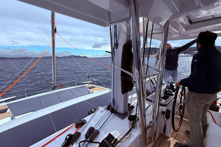 Nous sortons de Toulon et envoyons les voiles : la grand-voile à corne, noire pour cet essai, grimpe rapidement grâce aux winchs électriques. Le génois suit dans la foulée. Deux configurations existent : auto-vireur pour les flottes charter, plus simple pour les équipages non expérimentés, ou génois à recouvrement, plus puissant, plus fin, destiné aux propriétaires. Sous GV + génois, le 5.2 avance autour de 7 nœuds dans cette brise médium. Le bateau reste très stable, silencieux, cohérent, sans aucune brutalité. Une fois le Code 0 déroulé, la vitesse passe entre 8,5 et 9 nœuds, toujours sans effort. La plateforme ne bronche pas, aucun bruit parasite, aucune vibration : on reste dans la philosophie Bali, une croisière douce, équilibrée. Un spi asymétrique est proposé, mais non installé sur cette unité.