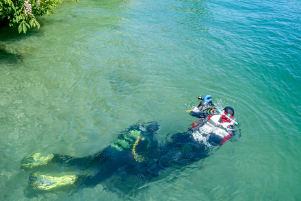 La plongée y est très structurée, avec de nombreux sites connus pour leur intérêt historique ou géologique. Les fonds alternent entre grandes pentes douces, plateaux intermédiaires et cassures plus marquées. Les plongeurs peuvent explorer plusieurs épaves bien conservées, des restes de pontons, des structures immergées et des zones naturelles où la faune lacustre s’observe plus facilement à faible luminosité. La visibilité est souvent remarquable, ce qui rend les plongées très lisibles et confortables, y compris pour les plongées profondes ou techniques. Les plongées de nuit y sont particulièrement appréciées pour leur ambiance et l’activité discrète du milieu.