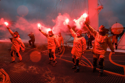 « Après 57 jours en mer, nous avons la chance d’être de retour ici, à Brest, avec tout le public présent et tous ceux qui nous ont soutenus. Bien entendu, nous étions huit à bord mais cette performance, c’est aussi celle de tous ceux qui nous ont accompagnés pendant cette incroyable aventure. Merci aussi à ceux qui nous ont encouragés autour du monde. Le fait que Thomas Coville et Benjamin Schwartz nous offrent un bouquet de fleurs sur le ponton, c’est très symbolique. Ils ont réalisé une prouesse exceptionnelle mais on n’a pas dit notre dernier mot (rires) ! Quoi qu’il en soit, ce qu’on vient de réaliser pose les fondations pour construire l’avenir. »
