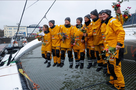 Le franchissement de ligne à 12 heures a eu valeur de délivrance. C’était enfin le temps de la légèreté, des embrassades et d’une bière bien fraîche et bien méritée. À l’arrivée à Brest, elles ont allumé des fumigènes et goûté à l’accueil chaleureux des Brestois. Si la pluie a redoublé d’intensité, elle n’a eu raison ni de leur enthousiasme, ni de leur bonheur communicatif. Thomas Coville et Benjamin Schwartz, détenteurs du Trophée Jules Verne depuis la veille, leur ont remis des fleurs aux pontons, symbole du respect qui unit les femmes et les hommes de mer. Des centaines de spectateurs se sont ensuite massés autour de la scène pour les applaudir et les féliciter. Une communion avec le public, à Brest comme partout dans le monde à travers les réseaux sociaux, qui a montré la forte adhésion populaire qui les a accompagnés pendant 57 jours. Au fil de cette aventure hors norme, ces drôles de dames du large ont créé un précédent et une première marque de référence. Désormais, les huit navigatrices cultivent le doux espoir de susciter des vocations chez les petites filles et les convaincre d’écrire à leur tour leur propre histoire. Alexia et ses "girls", elles, resteront à jamais les premières, à toujours des pionnières.