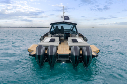 La grande nouveauté réside évidemment dans l’adoption d’une propulsion hors-bord. Le wallypower50X introduit dans la gamme l’efficacité des blocs Mercury Marine. En configuration standard, les Mercury Verado V10 de 425 ch permettent d’atteindre 50 nœuds en vitesse maximale et 34 nœuds en croisière (données préliminaires). Pour ceux qui recherchent davantage de sensations, la version équipée des Mercury Racing V8 de 500 ch – choisie pour la coque n°2 dévoilée à Miami – pousse la vitesse de pointe à 54 nœuds pour une croisière à 36 nœuds. La carène, développée en synergie entre l’équipe Wally et l’ingénierie du Ferretti Group, promet stabilité, contrôle et plaisir de pilotage, y compris à haute vitesse.