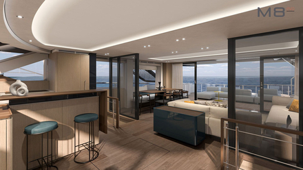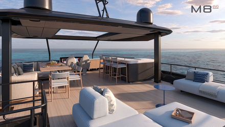 La M8 EVO se distingue également par la flexibilité de ses aménagements. L’intérieur comme l’extérieur peuvent être personnalisés selon les envies, grâce à une sélection de mobiliers et de finitions qui permettent de créer une ambiance unique. Le flybridge illustre parfaitement cette philosophie. Entièrement modulable, il peut être configuré comme un espace de détente, un lieu de réception ou un véritable salon extérieur. Cette capacité d’adaptation permet au yacht de répondre à des usages très différents, qu’il s’agisse de croisières familiales, de voyages au long cours ou de navigation entre amis. Chaque détail a été pensé pour offrir une expérience sur mesure, sans jamais sacrifier l’harmonie générale du design.