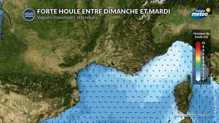 Sous l’effet de ce vent durable, la houle va rapidement se lever, avec des vagues pouvant atteindre 4 à 5 mètres, en particulier entre lundi et mardi, période la plus agitée de l’épisode. La mer deviendra forte, avec des creux courts et désordonnés, typiques des situations de vent soutenu en Méditerranée.