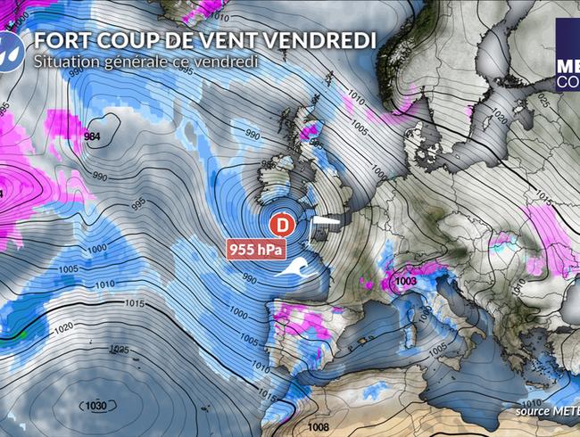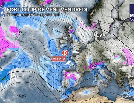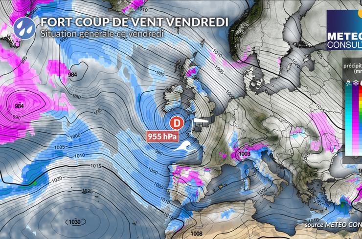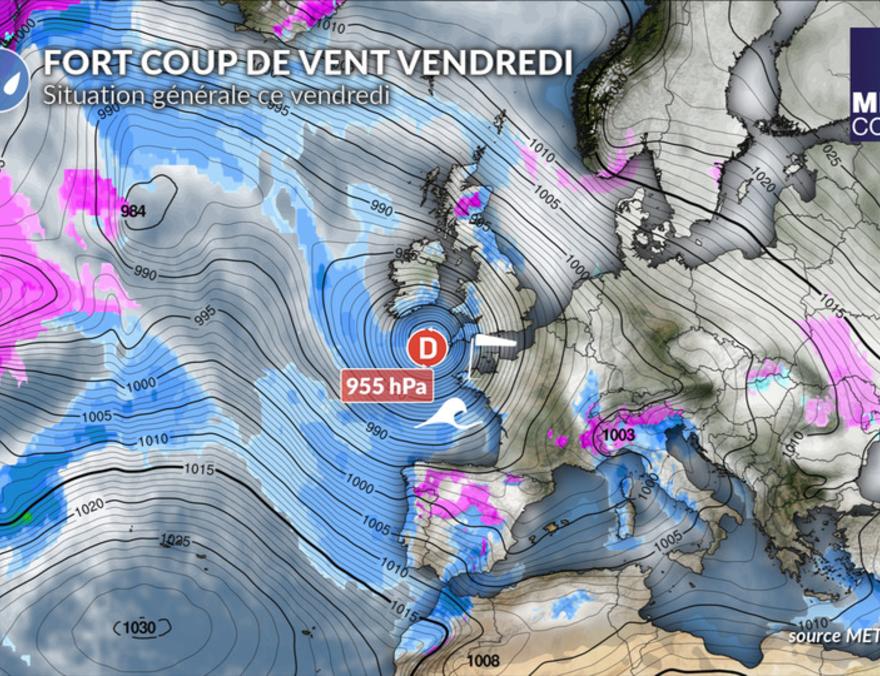 La dépression nommée Ingrid va fortement se creuser à 955 hPa dans la journée de vendredi en mer Celtique. Nous parlons de "bombe météo" car la baisse de pression dépasse 24 hPa en 24 heures. Un fort gradient de pression s'établira à l'avant de la dépression en mer d'Iroise et sur le nord du golfe de Gascogne avec un coup de vent durable car la dépression circulera très lentement. Les rafales de sud à sud-ouest atteindront le stade de la tempête en mer d'Iroise avec des rafales d'une soixantaine de nœuds. Sur les côtes bretonnes et le nord du golfe de Gascogne, les rafales atteindront 50 à 55 nœuds.