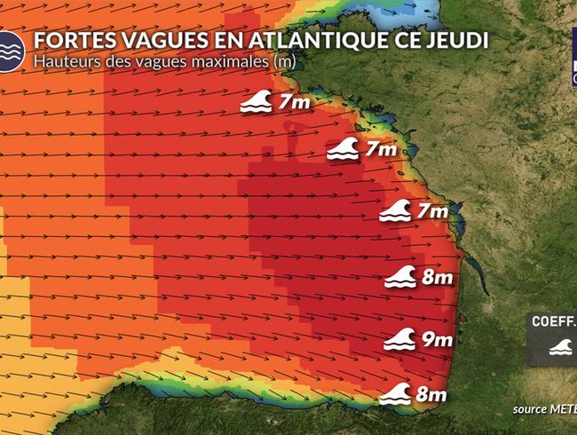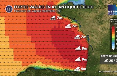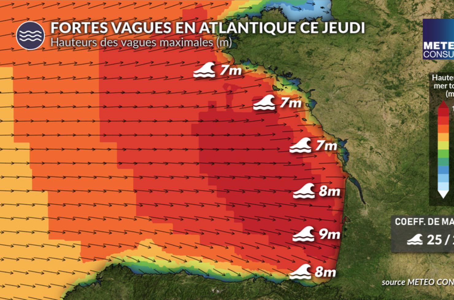 Sur la façade atlantique, et plus particulièrement au large de l’Aquitaine, les modèles confirment une mer très grosse à localement énorme, avec des vagues pouvant dépasser 8 à 9 mètres au plus fort de l’épisode. Le vent soufflera en tempête, atteignant force 10 à 11 Beaufort sur le littoral et au large, avec des rafales supérieures à 130 km/h sur la côte. Dans ces conditions, la navigation devient extrêmement délicate, y compris pour les unités expérimentées.