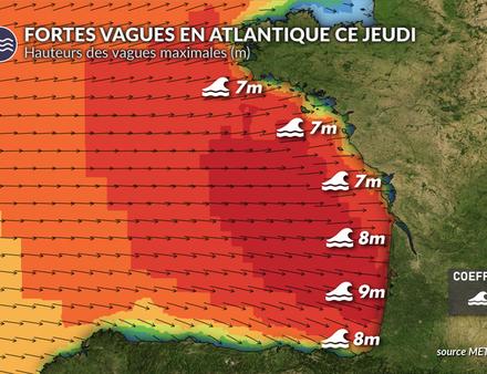 Point à souligner toutefois : les coefficients de marée restent très faibles (25 à 28), ce qui limite significativement le risque de submersion marine malgré la puissance de la houle. Les franchissements localisés restent possibles, mais le contexte des marées est favorable.