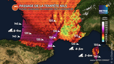En Méditerranée, la dégradation sera tout aussi marquée. Le resserrement rapide du gradient de pression générera un net renforcement du vent. Les vents atteindront force 11 Beaufort dans le golfe du Lion, avec des rafales dépassant 150 à 160 km/h sur les caps exposés et en mer. La mer deviendra très forte à grosse, avec des vagues de 5 à 6 mètres, notamment sur le bassin occidental. La façade ouest de la Corse sera particulièrement exposée, avec un risque accru de submersions localisées, sous l’effet combiné de la houle et du vent violent.