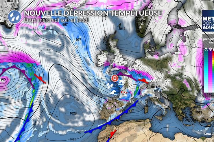 Dans l’après-midi de mercredi, le vent de sud-ouest forcira nettement sur la partie nord du golfe de Gascogne, sous l’influence d’une nouvelle dépression se creusant en mer Celtique. Les rafales atteindront en fin de journée 45 à 50 nœuds et s’accompagneront de fortes pluies. Dans la nuit de mercredi à jeudi, l’ensemble du golfe de Gascogne subira un fort coup de vent avec des vents moyens de 35 à 40 nœuds et des rafales tempétueuses pouvant atteindre jusqu’à 65 nœuds.