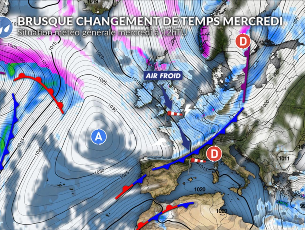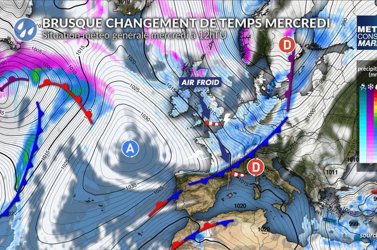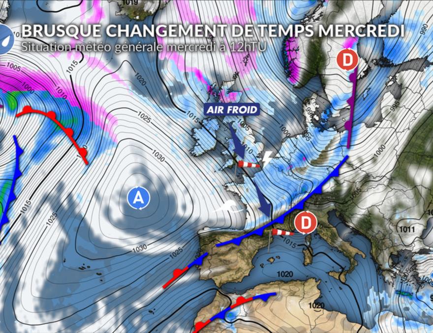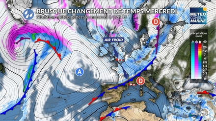 Jusqu’à mardi, les conditions restent globalement favorables en Manche, en Atlantique comme en Méditerranée, avec des vents faibles ou modérés et une mer peu agitée. Dès mercredi, le contexte météo change radicalement. Un flux de nord-ouest très dynamique se met en place entre un anticyclone au cœur de l’Atlantique Nord et un vaste système dépressionnaire sur l’Europe du Nord. Dans ce régime de nord-ouest, un front froid va rapidement plonger de la Manche vers la Méditerranée ce mercredi avec le retour de la pluie et de fortes rafales de vent. Il sera suivi d’un régime traîne active avec des grains orageux et des giboulées entrecoupées de périodes d’éclaircies. Le vent sera très instable en force et direction avec de fortes rafales sous les grains.