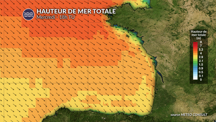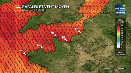 Sur la Manche et le littoral atlantique, le vent de nord-ouest va se renforcer nettement dès mercredi, avec des rafales de 40 à 45 noeuds, localement davantage au passage des grains. Cette situation génère une mer rapidement agitée à forte, avec des creux, notamment au large.