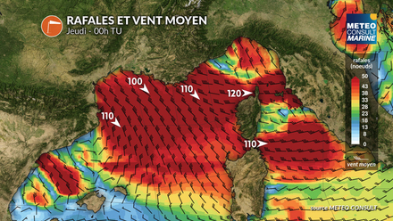 En Méditerranée, le changement sera tout aussi marqué avec la mise en place d’un fort mistral et d’une tramontane durable à partir de mercredi après-midi. Les rafales pourront atteindre 45 à 50 noeuds dans les zones exposées, notamment dans le golfe du Lion et sur Ouest Provence. La mer deviendra rapidement forte au large, avec une houle courte et cassante rendant les conditions particulièrement difficiles, surtout pour les petites unités.