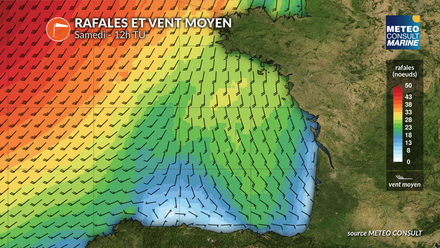 En Manche, le vent prend une composante sud-sud-ouest à l’avant d’un front perturbé progressant en mer Celtique. Il souffle entre 15 et 20 nœuds mais se renforce nettement en soirée à l’approche du front froid de la perturbation traversant la Manche dans la nuit de samedi à dimanche.