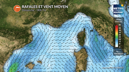 Les conditions anticycloniques persistent en Méditerranée avec un temps calme et ensoleillé. Le vent devient faible à modéré (force 2 à 4), orienté au sud-est sur le golfe du Lion et d’ouest à sud-ouest entre Corse et continent. La mer s’aplanit progressivement, devenant peu agitée.