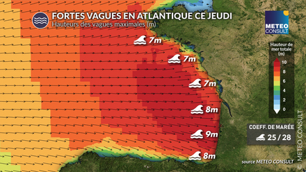 La journée de jeudi est sous surveillance en Atlantique avec un vent d’ouest fort atteignant une quarantaine de nœuds pour ce qui est du vent moyen avec des rafales tempétueuses de l’ordre de 60 nœuds sur une large partie sud du golfe de Gascogne. La mer deviendra grosse avec des vagues de 8 à 9 mètres au large de la côte aquitaine Sur la partie nord du golfe de Gascogne, le vent soufflera à peine moins fort et les vagues venant de l’ouest pourront atteindre 7 à 8 mètres au large.