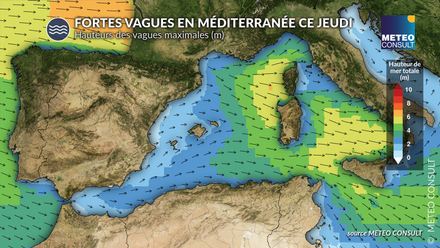 Le bassin méditerranéen verra le vent commencer à se renforcer dès mercredi avec un vent d’ouest soutenu le matin sur le golfe du Lion, puis l’après-midi entre PACA et la Corse. Mais c’est surtout jeudi qu’un fort coup de vent à tempête est attendu entre le golfe du Lion, le littoral varois et la Corse. En lien avec un courant jet d’altitude très puissant et un resserrement important des isobares en surface, le vent d’ouest soufflera en tempête entre le golfe du Lion et la côte occidentale de la Corse avec des rafales qui pourront atteindre temporairement jusqu’à 70 nœuds. La mer deviendra très forte avec des vagues de 5 à 6 mètres attendues en soirée sur la côte occidentale de la Corse. Il faudra donc éviter toute sortie en mer étant donné ces conditions dantesques ce jeudi. Il faudra éventuellement profiter d’une brève accalmie vendredi avant une nouvelle forte dégradation venteuse pour le week-end.