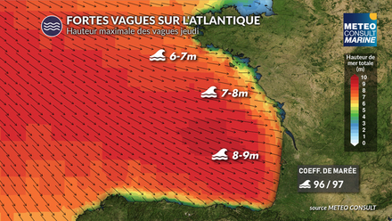 La journée de jeudi sera sous haute surveillance en Atlantique avec la combinaison des grandes marées, de violentes rafales de vent et d’une grosse houle venant du large. Avec des coefficients de marée proches de 100 et de grosses vagues arrivant par l’ouest (6 à 9 m au large), le risque de submersion sera important sur les côtes les plus exposées, notamment eu le littoral aquitain. Les conditions de navigation seront périlleuses avec le vent d’ouest soufflant à près de 40 nœuds, la mer grosse et les courants de marée qui pourront jouer les troubles fêtes. Il est donc préférable d’éviter toute navigation et de bien arrimer et sécuriser vos embarcations dans les ports.