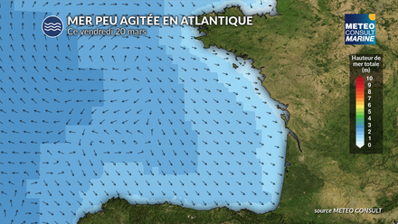 Sur les côtes de l'Atlantique, les conditions anticycloniques domineront jeudi et vendredi avec un temps ensoleillé accompagné d'une grande douceur. Un vent d’est modéré concernera le nord du golfe de Gascogne, tempérant un peu la douceur. La mer sera belle à peu agitée du sud de la Bretagne au pertuis charentais, un peu plus agité sur la côte aquitaine avec une houle résiduelle de nord-ouest de 1m à 1m50. Au cours du week-end les conditions météo pourraient se dégrader progressivement avec un ciel passagèrement nuageux samedi et le retour de quelques averses dimanche.