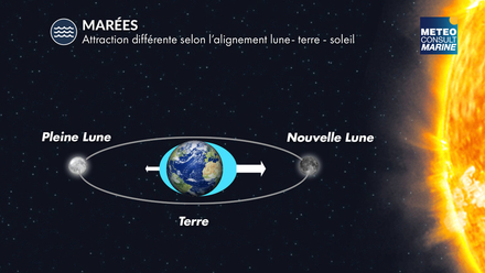 Les marées qui correspondent à des variations du niveau de la mer sont dues à la gravitation de la Lune et du Soleil autour de la Terre. La lune agit comme un aimant sur les océans. Sa force d'attraction sur la Terre est deux fois plus élevée que celle du soleil. Les grandes marées appelées aussi marées de vives eaux se produisent au moment de la Pleine Lune et de la Nouvelle lune, quand la Lune et le Soleil dont dans l'alignement de la Terre. Ils s'attirent ainsi fortement. Lors des équinoxes, le soleil exerce une attraction plus forte sur la Terre que pendant le reste de l'année, car il est à l'aplomb de l'équateur. Par conséquent, la surface de l'eau est fortement attirée par le Soleil, ce qui amplifie les marées. On parle alors de grandes marées d'équinoxe pour les distinguer des grandes marées classiques où le marnage (différence entre basse mer et haute mer) est un peu moins important.