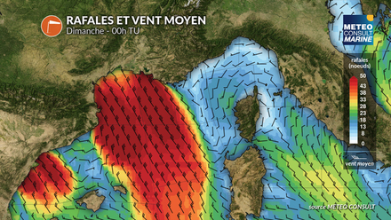 Dans la nuit et la journée de dimanche, mistral et tramontane s’intensifient à nouveau autour du golfe du Lion avec un vent moyen de nord-ouest de 35 à 40 nœuds et des rafales tempétueuses atteignant 50-55 nœuds le long de la côte et 65-70 nœuds en allant vers le large. La Méditerranée prend alors un aspect très formé, avec des creux de 4 à 5 mètres au large.