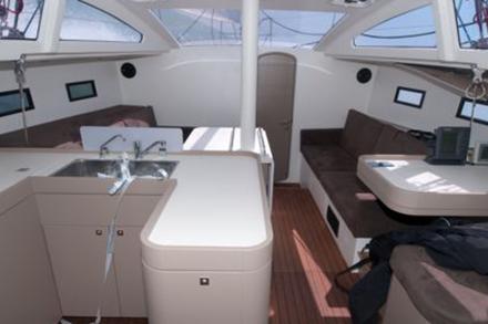 Si les aménagements sont fidèles aux fondamentaux de la marque rochelaise - la vue sur l'avant, le local technique, la couchette de mer -, il fait preuve d'un soin nouveau apporté au design et aux volumes. Très largement éclairée par de nombreux panneaux de pont zénithaux et des hublots, la vue sur mer depuis la table à carte et la cuisine est imprenable.