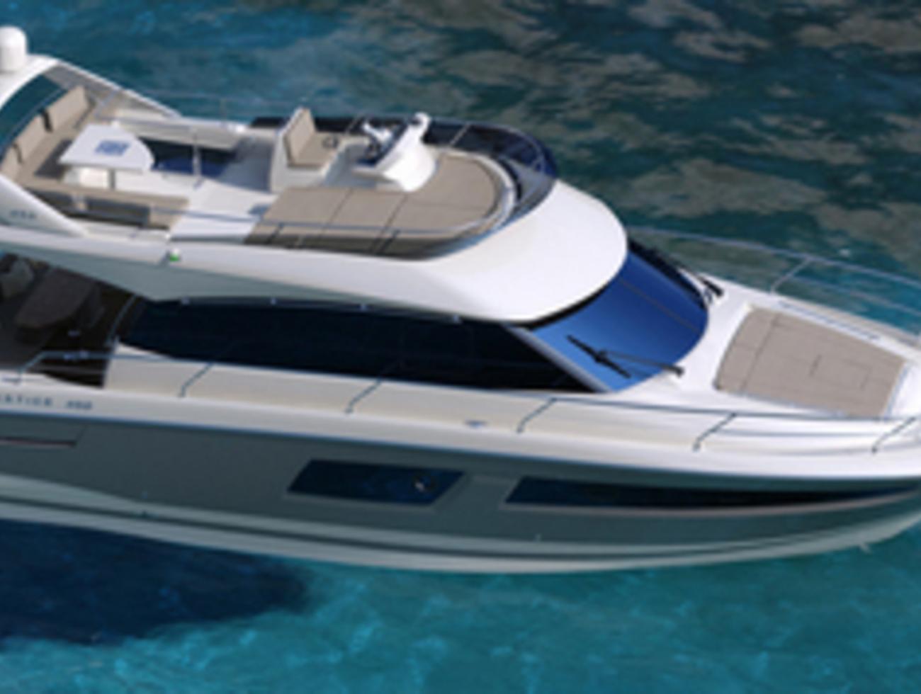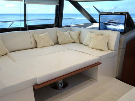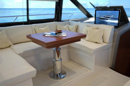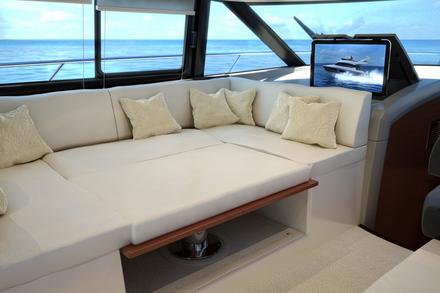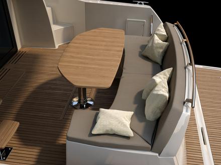 L’agencement intérieur novateur sur un niveau du PRESTIGE 450 lui confère un volume bien supérieur à ses concurrents. Niveau confort, le plan de pont a été étudié pour faciliter la vie à bord grâce à de larges passavants, un vaste cockpit donnant sur la plateforme de bain hydraulique, une passerelle latérale, un bain de soleil avant encastré ou encore le grand coffre de cockpit pouvant accueillir une annexe semi-rigide dégonflée de 2,60 mètres. Comme sur tous les bateaux de la gamme, le cockpit s’inscrit dans le prolongement de l’espace intérieur et offre un accès direct à la cabine arrière, dotée elle aussi d’une salle de bain indépendante. Parmi les points forts du bateau, on retrouve le salon, qui offre une vue panoramique sur 360°. Confortable et fonctionnel, aussi bien en mer qu’au mouillage, il peut accueillir jusqu’à huit personnes autour de la table. Ingénieux, le carré peut se transformer la nuit tombée en un lit double king size. Le poste de pilotage professionnel à deux places, situé à proximité du carré, offre une excellente visibilité, ainsi qu’une bonne ergonomie permettant de profiter de tous les instruments de navigation mis à disposition, qui comprennent un écran tactile de 12’’ centralisant toutes les informations, les commandes moteurs et un joystick IPS placé à portée de main.
