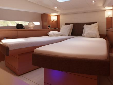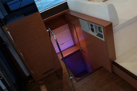 Incarnant parfaitement la nouvelle génération PRESTIGE, le PRESTIGE 450, subtil alliage de luxe artisanal et de haute technologie, concentre en 14 mètres tout le savoir-faire du chantier. S’inspirant du PRESTIGE 500 sorti il y a trois ans, le PRESTIGE 450 est aujourd’hui le seul 45 pieds du marché à être doté d’une cabine centrale avec un accès indépendant. Equipée de nombreux rangements, d’un dressing et d’un bureau, la cabine propriétaire possède également une vaste salle d’eau. La cabine VIP, qui se distingue par son lit double convertible en deux lits simples et une salle de bain privée, forme quant à elle un autre espace indépendant à l’avant du bateau.