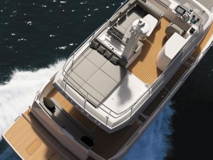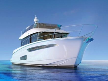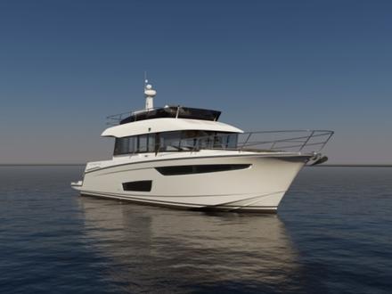 Le Voyage 42 inaugure la nouvelle gamme de vedettes Flybrige de Jeanneau, Voyage, dont le premier bateau sera présenté au Nautic de Paris puis à Düsseldorf.