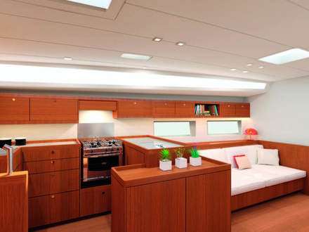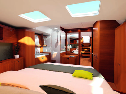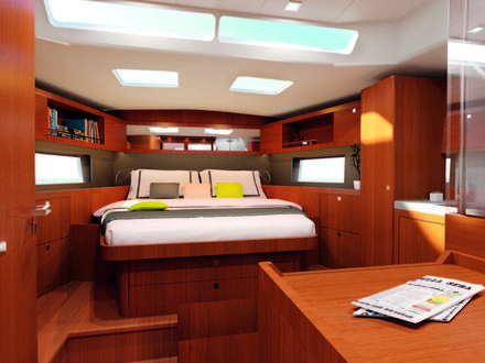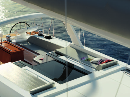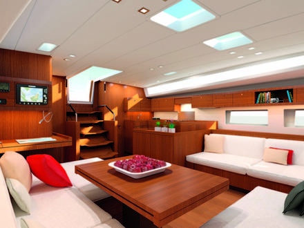 Bateau de croisière aux lignes épurées et modernes, reprenant les codes du design contemporain, l’Oceanis 55, dernier né de la gamme Oceanis de Bénéteau, s’inscrit dans la lignée de ses prédécesseurs. « Nous avons commencé à renouveler la gamme l’an dernier avec les Oceanis 41, 45 et 48, qui ont marqué l’arrivée de carènes plus raides, qui ne gîtent pas beaucoup. Ces bateaux sont plus équilibrés, avec un mât reculé et une carène plus volumineuse à l’arrière. Le cockpit est quant à lui plus grand qu’avant », explique Bruno Belmont, Directeur du Développement Produits de Bénéteau. « Nous nous sommes rendus compte que la plupart des gens passaient beaucoup plus de temps au mouillage qu’en navigation. Nous avons donc pensé ce bateau pour qu’il soit confortable au mouillage, tout en étant très marin et sain par tous les temps ». En navigation, l’Oceanis 55 est facile à manœuvrer. Mât au centre du bateau, foc à faible recouvrement, écoute de grand voile sur arceau, Bénéteau a trouvé des solutions pour augmenter l’équilibre et la performance. Les winches de génois, centrés dans le cockpit, sont quant à eux gage de sécurité en mer et de facilité d’utilisation.