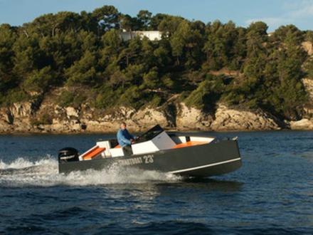 Chic et confortable, le Smarboat 23 peut se targuer d’être le seul bateau à moteur de sa catégorie à avoir été dessiné par le cabinet d’architecture navale VPLP, qui a apporté au motonautisme un design de coque synthétisant toutes les évolutions de carène du monde de la course au large à la voile. Présenté sur 45 salons nationaux dont ceux de Miami, Moscou, Londres, Oslo, Stockholm, Gênes, Rome, Barcelone et pour la première fois à Shanghai, le Smartboat 23 rencontre depuis sa sortie un franc succès. Nominé pour le « bateau européen de l’année » il y a deux ans, il sera en lice pour le titre de « bateau de l’année » au London Boat Show en début d’année. Entièrement customisable niveau couleurs aussi bien pour la coque que pour la sellerie, le bateau au design avant-gardiste est à la fois économique de par son poids et très marin. A vitesse réduite, il évolue comme un voilier dans les petits airs, alors qu’en vitesse de pointe, il peut atteindre les 42 nœuds. « Le Smartboat 23 est très marin grâce au système de ballasts à l’avant, qui est unique dans le monde du motonautisme. Sa carène, qui n’est pas en V contrairement à la majeure partie de ses concurrents, permet une navigation ou un échouage à plat et une très bonne tenue en mer », commente Hedy Kardous, Président de Smartboat, basé à Vannes. Smart peut vouloir dire classe et malin à la fois. Cela caractérise parfaitement bien le bateau ». L’aspect confort n’est pas en reste. Le Smartboat 23, qui peut accueillir jusqu’à 11 personnes à son bord, est doté d’un bain de soleil, de toilettes, d’un frigo et d’un couchage pour deux personnes.