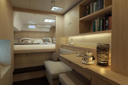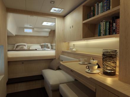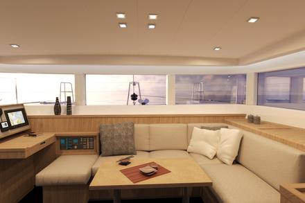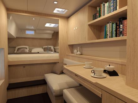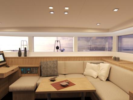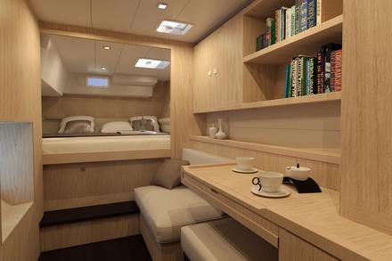 Partant du constant que les plaisanciers passent de plus en plus de temps au mouillage, Lagoon a misé sur la facilité de navigation et le confort pour répondre aux attentes de ses clients, sans pour autant altérer les qualités nautiques du bateau. Dans la conception d’un catamaran de croisière de 39 pieds, une bonne exploitation du volume est l’une des priorités. A cet égard, les choix de Nauta Design et des équipes Lagoon associent ingéniosité et élégance. Le carré lumineux accueille une grand table sur l’avant tribord, une zone dédiés à la navigation, alors que l’arrière bâbord héberge une cuisine en « L » en vis-à-vis direct avec le cockpit. Et comme la plupart des catamarans de cette taille, le Lagoon 39 est disponible en plusieurs versions. « Il existe une version avec deux cabines, une dans chaque coque avec deux toilettes, une avec trois cabines avec un flotteur propriétaire et un flotteur invités, et une version quatre cabines destinée principalement à la location, avec deux cabines dans chaque flotteur », explique Bruno Belmont.