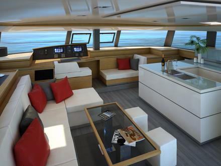 Misant sur l’urban chic avec des lignes sobres et une discrétion des volumes, Isabelle Racoupeau a travaillé les intérieurs dans une esthétique aussi contemporaine que chaleureuse, sans oublier le côté fonctionnel du bateau qui permet une circulation fluide entre les différents espaces de vie grâce à de grandes coursives. A l’extérieur, le flydeck, l’un des espaces de vie les plus appréciés à bord qui offre une excellente visibilité, est accessible du cockpit et des deux côtés par un escalier très sécurisant. Sofa de relaxation, tables d’appoint, banquettes, rien n’a été laissé au hasard pour permettre à tous de profiter de la navigation en toute sécurité. A l’arrière du flydeck, une surface de pont totalement dégagée permet l’installation de panneaux solaires et de matériel de télécommunication. L’ergonomie du poste de barre et l’efficacité de l’accastillage permettent quant à eux de mener le bateau dans les meilleures conditions possibles.