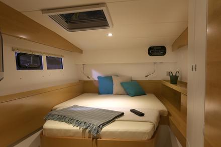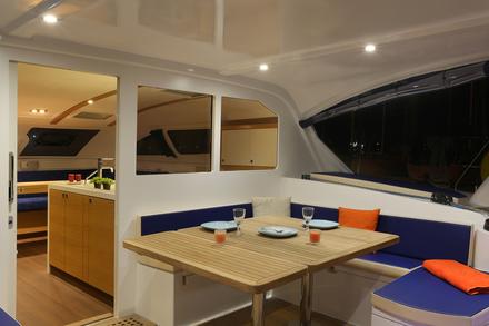 Taillé pour le long cours, le Nautitech 482, digne héritier du 47, affiche la même ligne épurée et marine reconnue que son prédécesseur. La reprise de certains éléments du Nautitech 542 tels que les postes de barres protégés et le design intérieur devrait assurer le succès du dernier né du chantier. « Le Nautitech 582 est un excellent marcheur. C’est le bateau le plus rapide et le plus confortable à la mer de sa catégorie, mais également l’un des plus haut-de-gamme du marché », nous explique Bruno Voisard, Président de Nautitech. Ciblant aussi bien les propriétaires que le marché de la location grâce à ses configurations trois ou quatre cabines, le bateau peut accueillir jusqu’à 12 personnes à bord, les pointes pouvant également être aménagées en cabines d’appoint. « Le Nautitech 482 est très facile à manœuvrer, seul ou en équipage réduit, poursuit Bruno Voisard. Son cockpit fermé rend le bateau très sécuritaire, ce qui permet de naviguer avec des enfants en toute tranquillité. D’ailleurs, la première unité a été achetée par un couple qui part faire le tour du monde pendant trois ans avec leurs cinq enfants ». Pour l’heure, le chantier a déjà vendu cinq unités, en France, aux Antilles, en Turquie et en Chine. « Beaucoup de nos clients connaisseurs sont très intéressés par ce type de bateau ».