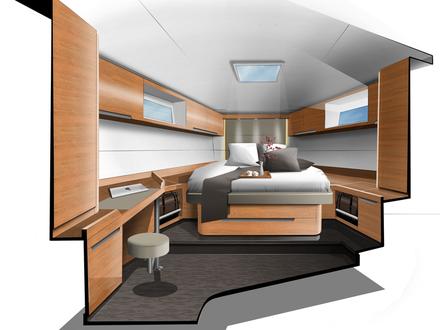 Le très grand cockpit du Centurion 57 a été pensé pour tous les usages, avec beaucoup d’espaces de circulation pour faciliter l’efficacité des manœuvres en équipage. Il offre en outre toute l’assistance nécessaire à la navigation en solitaire. L’accastillage, rigoureusement sélectionné sur des critères de qualité et d’efficacité, s’intègre quant à lui parfaitement dans les lignes épurées du pont. Montée sur vérins, la jupe arrière se transforme en plateforme et bain et facilite l’accès au garage en annexe.