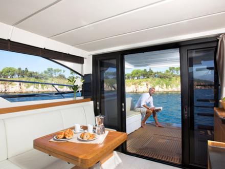 A l’intérieur, on retrouve un salon confortable, situé entre le cockpit et la cabine, comprenant un coin fauteuils, ainsi qu’une grande table de salon. Ses portes en verre coulissantes peuvent s’ouvrir complètement pour créer une sensation d’espace accrue, ou rester fermées pour plus d’intimité. A noter que le banc central et la table du cockpit peuvent être déplacés via un système de rails, permettant ainsi de reconfigurer le cockpit en fonction de ses envies. Le salon peut lui aussi être réaménagé pour créer plus d’espace. Des deux côtés du yacht, les grandes fenêtres offrent une atmosphère lumineuse. Sous le pont, Bavaria a opté pour une réalisation soignée et des solutions intérieures novatrices. Outre la luxueuse cabine propriétaire, le Virtess 420 comprend deux cabines « invités » avec salles d’eau spacieuses avec douches séparées.