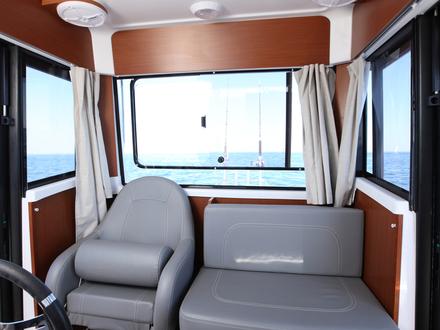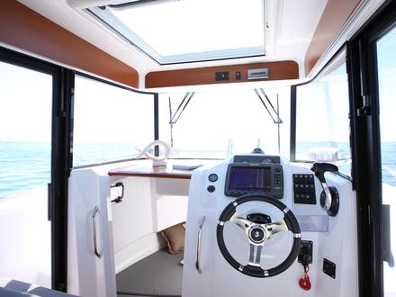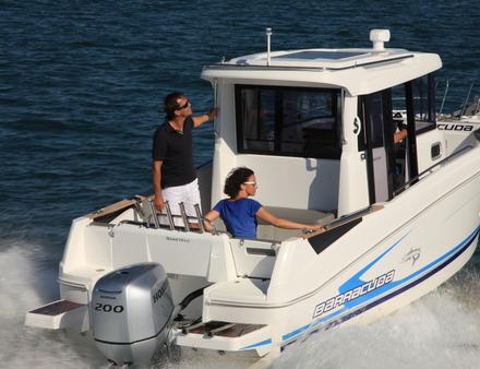 Si le Barracuda 7 se prête parfaitement à la pratique de la pêche, il fait également la part belle à la ballade, dans le plus grand confort. L’importance accordée aux surfaces vitrées, qui se caractérise notamment par un panneau de toit ouvrant, offre une belle lumière intérieure, et vient augmenter la sensation d’espace. La modularité du bateau permet d’accueillir une cuisine d’appoint avec un évier, un emplacement pour le réchaud, ainsi qu’un réfrigérateur et des rangements. Malgré sa petite taille, le bateau abrite également une cabine avant, dotée d’un couchette double et d’un WS indépendant, offrant ainsi au propriétaire un véritable espace de repos. A noter que le chauffage et la climatisation sont disponibles en option, tout comme l’ajout d’une plage de bain arrière, pour faciliter l’accès à la baignade.