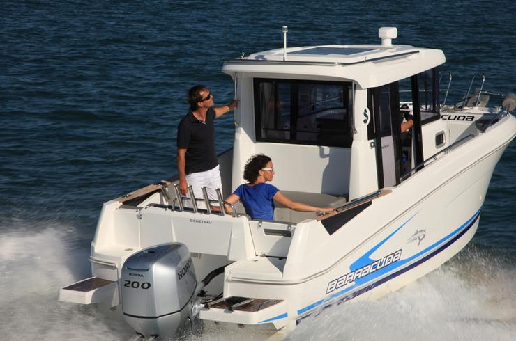Les adeptes de la pêche à la traine apprécieront particulièrement le design général de la coque, qui confère au Barracuda 7 une aisance de navigation par tous les temps, ainsi qu’une grande stabilité. Effilée et tulipée, l’étrave offre de son côté un passage de la vague en toute sécurité. Le vaste cockpit dégagé de toute casquette permet quant à lui les lancés au leurre en toute liberté. Equipé de trois coffres, dont deux peuvent se transformer en bacs à poissons, le Barracuda 7 dispose également d’un rangement arrière tribord, qui peut servir, en fonction des besoins, de baille à mouillage ou de vivier. La recherche d’une largeur optimale confère une aisance de circulation en walk-around, avec des passavants larges et profonds, et des francs-bords de 60 centimètres très protecteurs. Les amateurs de pêche pourront en outre repérer les eaux poissonneuses grâce à l’écran de dix pouces du tableau de bord et l’équipement en électronique Lowrance, dont le nouveau système de sondeur « Structure Scan », permet de visualiser les fonds de manière très précise.